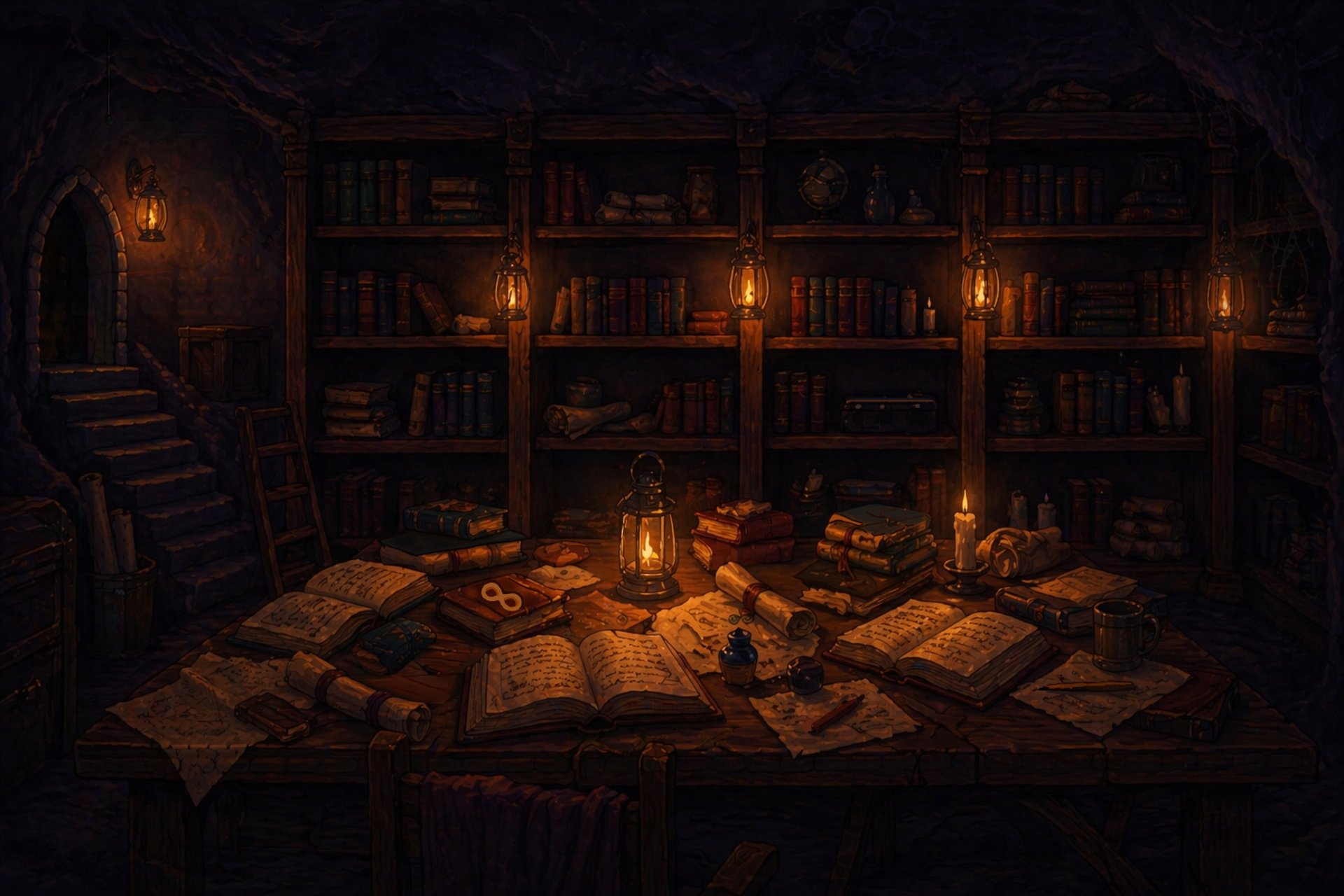 Con el correr de las eras, los antiguos eruditos de El Taller Oculto, han ido almacenando en las diferentes estanterías de la biblioteca subterránea, tanto material escrito como les ha sido posible. Al entrar allí, el olor a cuero gastado que se desprende de las viejas cubiertas, impregna el aire y colma los sentidos al mezclarlo con el perfume de la madera, amalgama de esencias que a menudo son acompañados por el aroma a café recién hecho. Este, en forma de una humeante taza, es la compañía predilecta de quien esta a punto de enfrascarse en una extensa sesión de lectura.